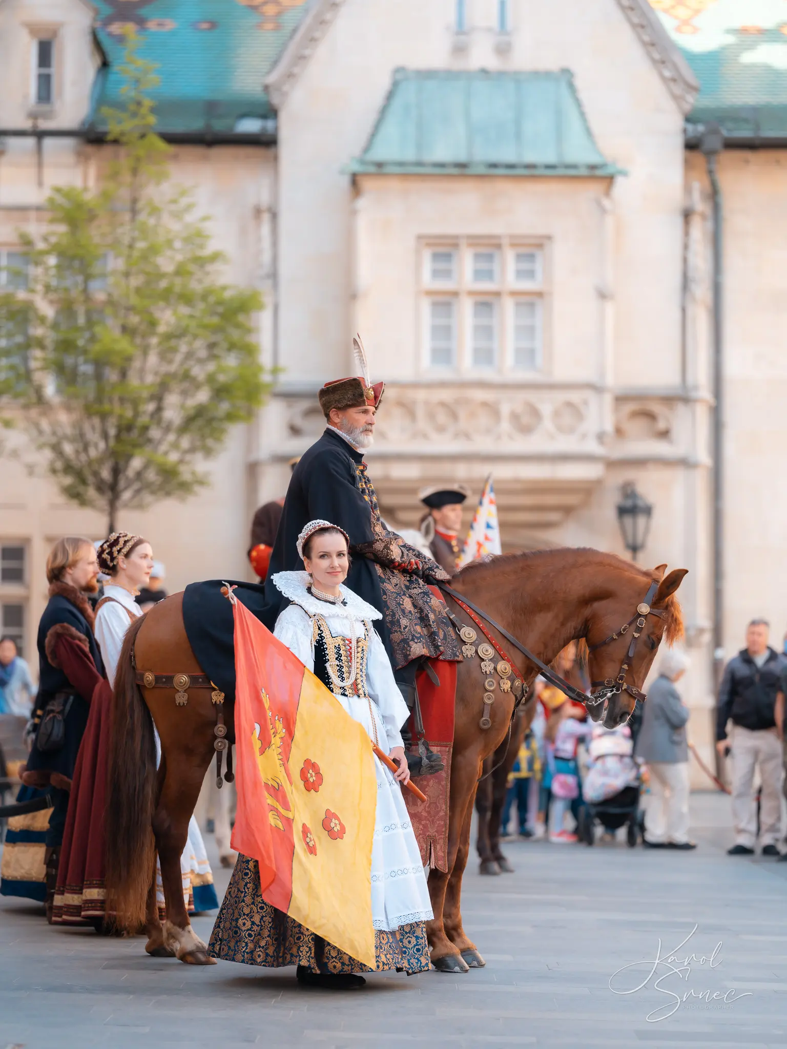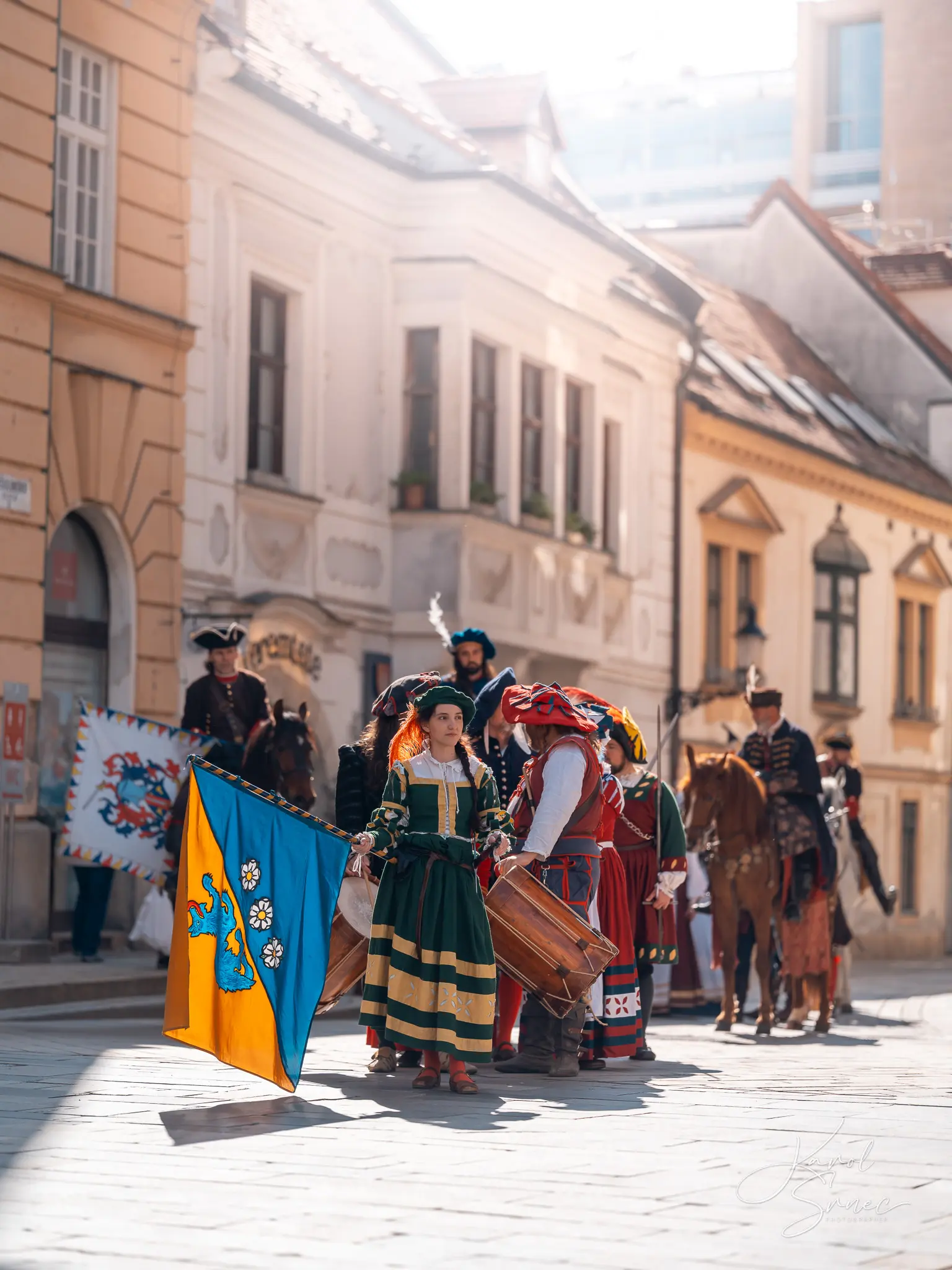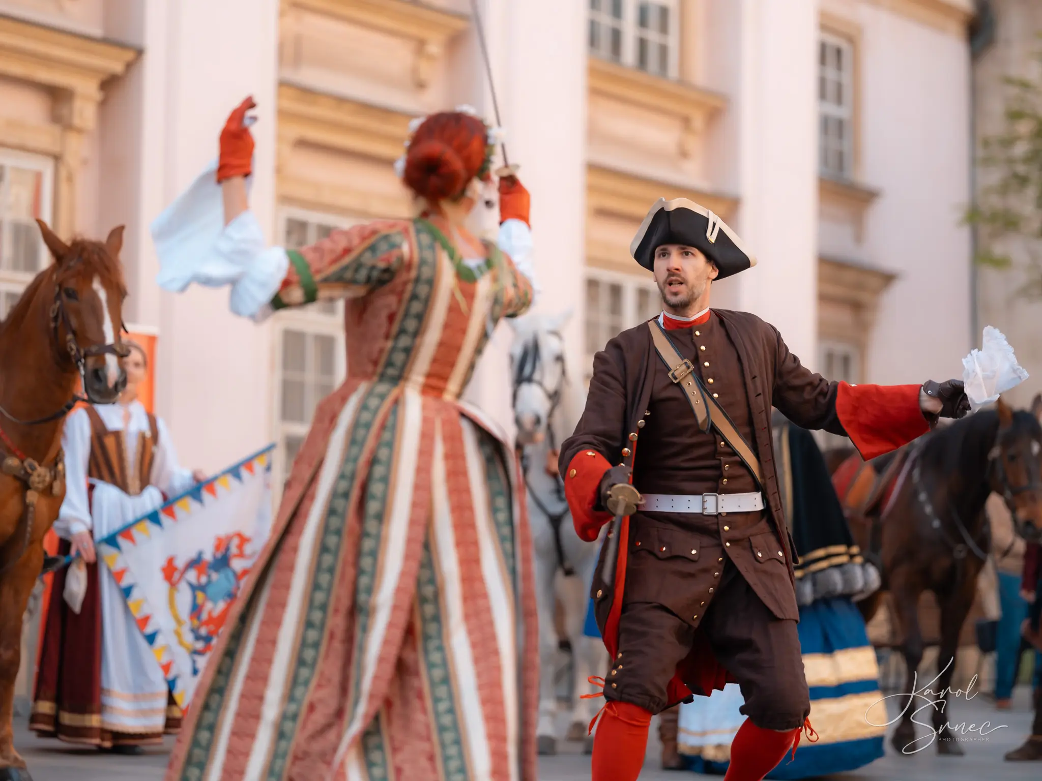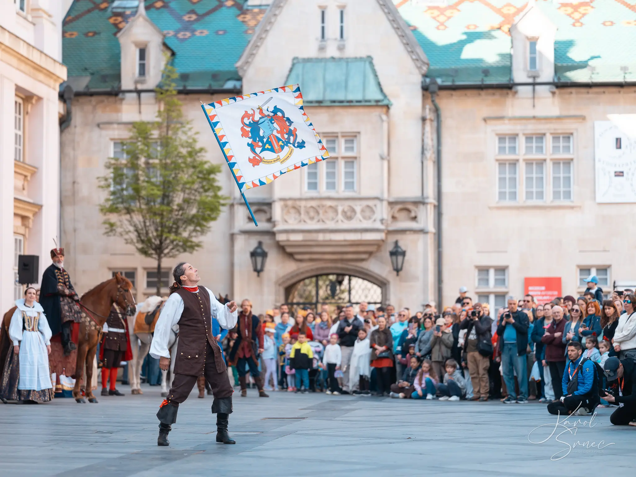 V našom TOSTABUR podaní nechýbal šerm, tanec, vlajkosláva, ani parádni jazdci na svojich tátošoch. Pripomenuli sme si tri slávne epochy bratislavskej histórie, ktorú nám priblížil pán Vladimír Grežo v družnom rozhovore s „duchom brány“ Primaciálneho paláca.
