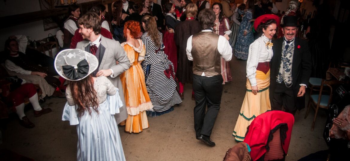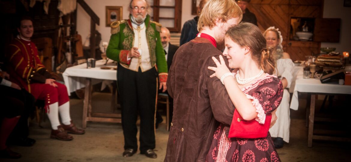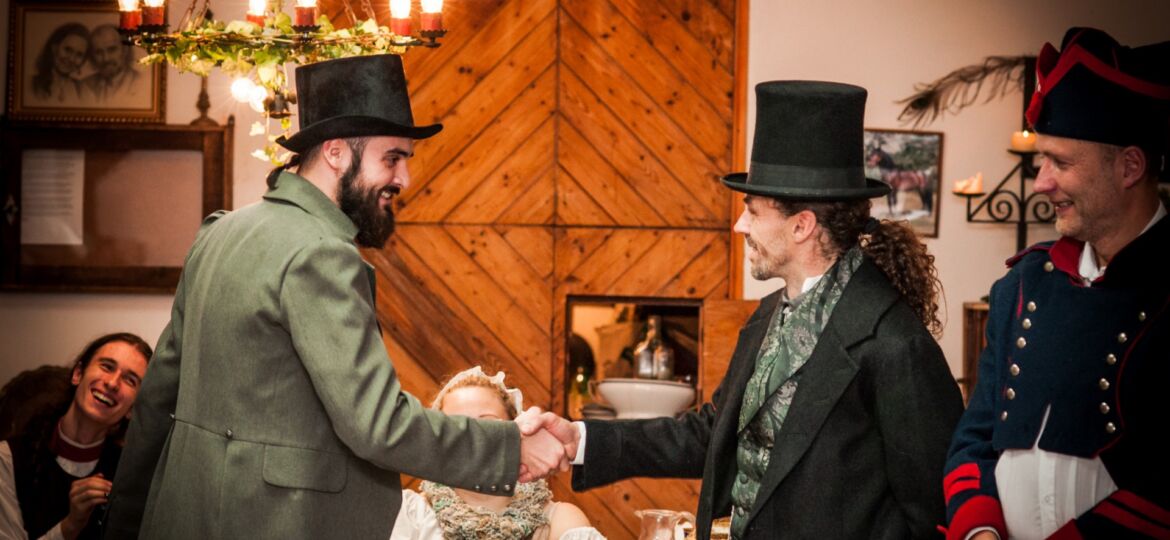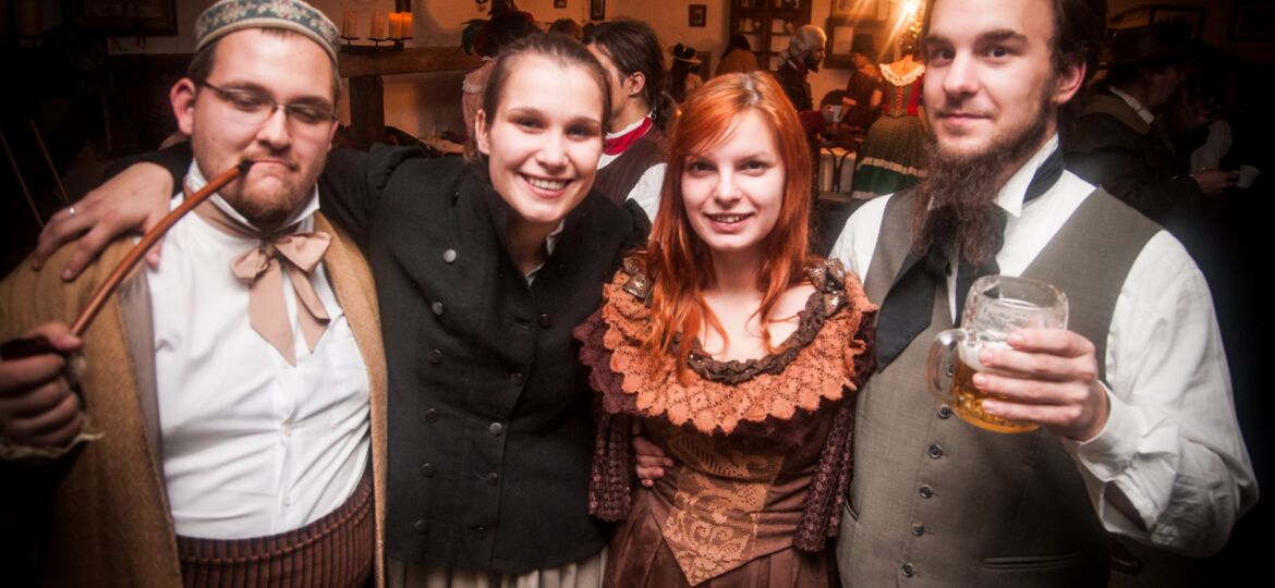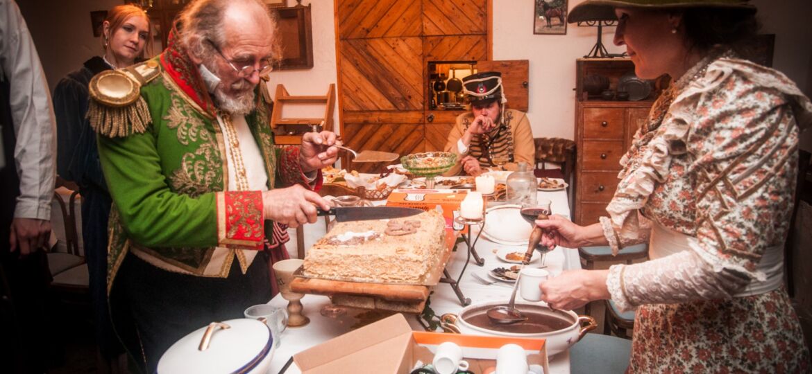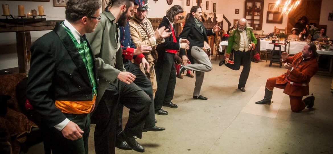Jedla, nápojov od výmyslu sveta! Šerm, tanec, smiech, spev a zábava až do rána – nie síce celkom bieleho, lebo v novembri sa pomerne neskoro brieždi – ale predsa do rána.